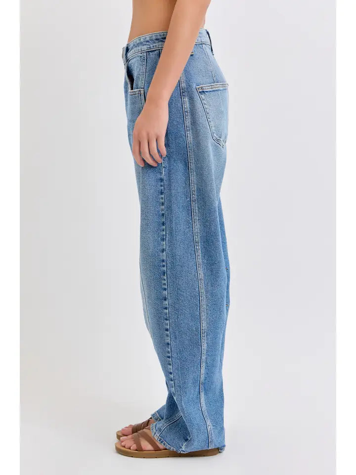 Mid-Waisted Barrel jean. Dart Details. Long Inseam. Belt loops + Zip fly. Medium denim.